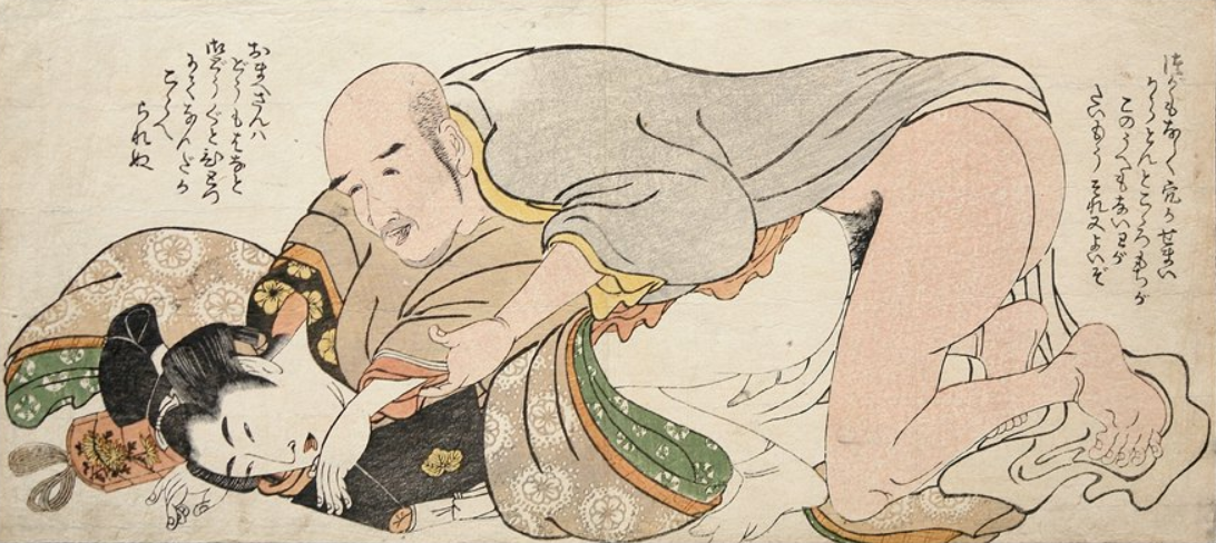 Kobo Daishi's Book bears the date 1598, well before the Genroku era (1688-1703) when books on sexuality were tinged with irony. Although not meant to be read ironically, the book nevertheless foreshadows the more modern Genroku approach to sex in the playfulness that comes through in certain passages. One such passage appears in the book's introduction: “The love of boys began in olden times when Kobo Daishi made a vow of love with Wen Zhou. Sentient Being (shujo) refers to a man and boy who fall in love with each other, become fast friends, and make a vow of brotherly love; the phenomenon is recorded in many books. Because Kobo Daishi began the practice of this way of love, it has been preserved all these years and continues to the present day in both Japan and abroad.”
