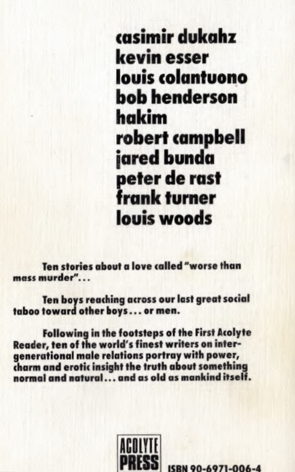 The Second Acolyte Reader, was published in June 1987 by The Acolyte Press, a publisher in Amsterdam recently founded by the American writer Frank Torey (1928-96) and dedicated exclusively to pederastic publications. It was the second of twelve volumes published over a decade when hopes for acceptance of Greek love had recently evaporated and it was coming under rapidly intensified persecution, both in the Netherlands and elsewhere. The stories in all the Acolyte Readers are by various authors, but they were all edited by Torey.
